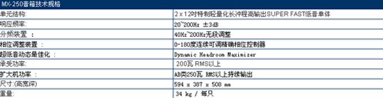 MK以累積超過(guò)30年制造超低音的經(jīng)驗(yàn)以及領(lǐng)先業(yè)界的技術(shù),全新升級(jí)設(shè)計(jì)NEW MX-250,以上一代MX-150超低音的全密閉式強(qiáng)化抗振箱體為基礎(chǔ)架構(gòu),采用特制輕量化長(zhǎng)沖程SUPER FAST低音單體,搭載全新研發(fā)250 Watt 高輸出功率的監(jiān) 聽(tīng)級(jí)擴(kuò)大機(jī)模組(穩(wěn)定連續(xù)輸出功率250瓦/500瓦峰值大功率輸出),輸出功率提升兩倍,使超低音能發(fā)揮更大的動(dòng)態(tài)以及超低頻音壓,使NEW MX-250擁有絕佳的控制力與單體反應(yīng)速度,完整還原延伸且豐富的超低頻細(xì)節(jié)!!輕松對(duì)應(yīng)各種音樂(lè)以及電影的播放!!