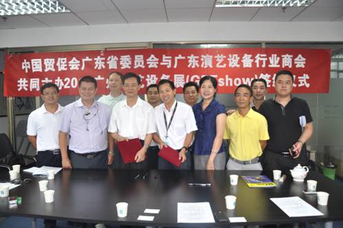 【音響網資訊】2011年7月4日,廣東演藝設備行業商會與中國貿促會廣東省委員會就共同主辦2012廣州演藝設備、智能聲光產品技術展覽會(GETShow)進行了盛大的簽約儀式。中國國際貿易促進委員會廣東省委員會陳耀桓副會長、敖部長一行,廣東演藝設備行業商會會長謝潤中、常務副會長梁國芹、副會長謝良、葉向權、薛建忠、徐海、黃作電共同出席了簽約儀式。