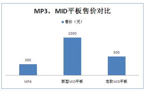 如果MID平板想要替代MP4,其售價應該和MP4產品相差不大。就目前的情況而言,采用A8A9核心,應用電容觸控屏幕,具備安卓2.x系統的最新產品,其售價已經低至999元,而性能不是太好的早期MID平板已經低至500元以下,更有甚者售價已經降至299元。