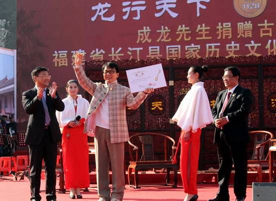 對此,長汀縣政府授予成龍“榮譽市民”稱號,并贈送他一把“名城汀州金鑰匙”。成龍表示,他現在是長汀人了,等他捐贈的古宅建好后,還要來長汀。