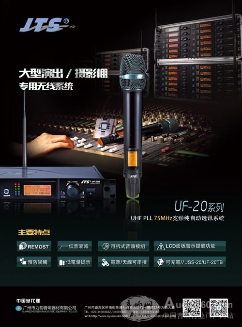 臺灣JTS UF-20System 一拖二真分集75M寬頻純自動選訊無線麥系統,專為大型演出、錄音棚而設計研發。經過JTS研發團隊不斷努力、不斷改進,UF-20無論音色、接收距離、新型功能、穩定度都完美達到國際水準,現即將進入量產倒計時階段,歡迎廣大音響界朋友來電預定試聽。