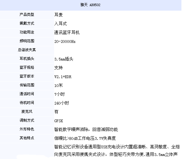編輯點評:使用手機在行車的途中接打電話在新交規出臺之后成為了很多人的噩夢,但是一款通訊藍牙耳機就能很好的解決這一問題,雅天推出的這款ABH502不僅能讓用戶更好的在行車的途中進行接打電話,并且還可以在駕車之余享受美妙的音樂,讓用戶省去了需要置辦兩款耳機的煩惱,可以節省不少的預算。