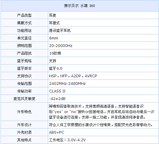 編輯點評:水滴是形容賽爾貝爾D80通訊藍牙耳機最為恰當的名字,這款通訊藍牙耳機小巧簡約精致,耳掛式的設計搭配上其輕巧的重量更加適合用戶長時間的佩戴,其帶有的音樂播放設計也讓用戶可以更加輕松的選擇聆聽這款通訊藍牙耳機產品,感興趣的用戶絕對不要錯過。
