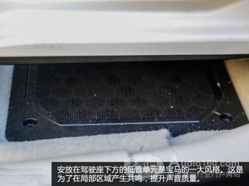 整套音響的布局基本符合寶馬原有的設計風格,位于座椅下方的低音單元幾乎是所有寶馬車型音響的特點。我們看到該車采用了兩分頻設計,門板上的揚聲器為中高音單元,整車并沒有配置中置揚聲器。