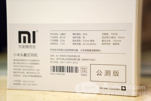 背面的標簽上有各種參數與特性,在這簡單的說說。小米頭戴式耳機特性有:1.專利半開放聲學結構設計、專利雙模具(貼耳式/罩耳式)色戒、左右獨立聲道直通鍍銀線、50mm鈹振膜喇叭。在參數方面,小米頭戴式耳機的阻抗為32Ω、靈敏度為100dB、頻率范圍為20~20000Hz、重量為220g。