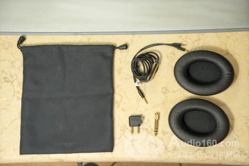 小米頭戴式耳機的所有配件,包括了收納袋、飛機轉接頭、6.3mm轉接頭以及大耳罩與線材。