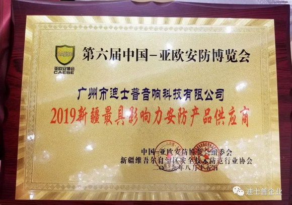 展會期間還舉行了頒獎活動,迪士普喜獲2019新疆最具影響力安防產品供應商殊榮。