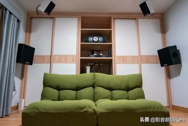 進入小明同學的閣樓,空間并不大,可井井有條,100寸的屏幕在這里格外顯大,與之對稱的后墻被設計的非常合理,設備全部居中擺放,顯然花了心思。由于層高只有2米,這兩人座的沙發鋪地而起,前置和環繞的高度也要做出調整,比耳朵略高就可以了,這樣天空聲道才有足夠的呼吸空間。