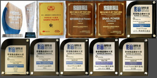 中國獎項: 2015-2016年 – 我愛家庭影院創意設計大賽優秀大獎 2016年 – 家庭影院技術客廳影院獎 2016年 – U2影音極品綜合實力獎 2017-2018年 – U2-Ⅱ家庭影院技術優秀器材推薦獎 2018年 – IW6影音極品年度人氣獎 2018年 – 音響網年度十大優秀家庭影院音響品牌獎 2018年 – 行業影響力品牌獎 2018-2019年 – IW6家庭影院技術優秀器材推薦獎 2019年 – IW3獲得影音極品年度人氣獎 2019年 – U4-Ⅱ影音極品綜合實力獎 2020年 – S10B影音極品綜合實力獎 2020年 – U4-Ⅱ影音極品年度人氣獎