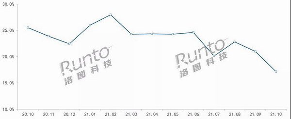 根據洛圖科技(RUNTO)數據顯示,2021年10月,百度、天貓精靈、小米、華為TOP4市場份額達到95.6%,較去年同期下降1.8個百分點,較上個月微降0.1個百分點。從銷量看,重點品牌銷量同環比均有所下降。