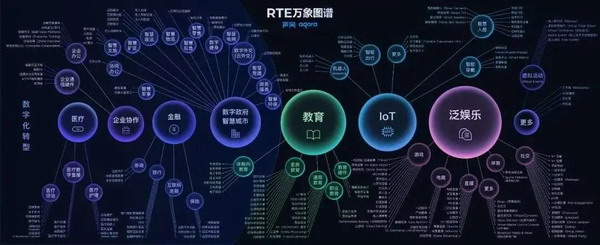 在2021年的RTE大會上,聲網總結和梳理了 20多個行業賽道以及超過 200 個行業場景,并重磅推出“RTE 萬象圖譜”。其中在社交、直播、教育、會議等領域已初步形成成熟場景,并且未來將長期存在。此外,也有大量遠超成熟場景的新萌芽場景,例如線上展會、云演唱會、在線自習室、視頻辦醫保、互動播客等等。從圖譜中可以觀察到,泛娛樂行業50+場景、教育行業30+場景、IoT行業20+場景,分別成為圖譜中場景數量最多的前三大行業。