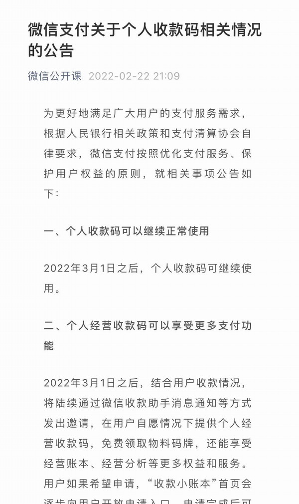 2月22日,中國支付清算協會公告表示,將新設“個人經營收款碼”。