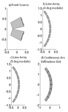 目標(biāo)垂直覆蓋角度設(shè)定為80度,進(jìn)行的比較如下:兩個(gè)具有40度垂直覆蓋角的模塊用來(lái)表示一個(gè)典型的點(diǎn)聲源揚(yáng)聲器解決方案。同時(shí)使用了兩種不同類(lèi)型的線(xiàn)陣列模塊,一個(gè)具有0度的波陣面,另一個(gè)具有5度的波陣面。每個(gè)模塊內(nèi)的虛擬聲源被設(shè)置得足夠小,以實(shí)現(xiàn)模塊內(nèi)的連續(xù)源假設(shè)。八個(gè)模塊用以實(shí)現(xiàn)80度的覆蓋角。相鄰模塊的號(hào)角喉部的頂部與底部之間的距離被設(shè)定為90 mm,以表示當(dāng)今線(xiàn)陣列模塊的典型結(jié)構(gòu)13)14)15)。