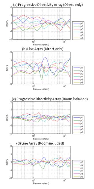 圖10顯示了覆蓋區(qū)域內(nèi)六個(gè)位置的頻率響應(yīng)的比較。參考響應(yīng)是這六個(gè)位置的響應(yīng)的平均值。清楚地表明,利用線(xiàn)陣列模塊,并施加增益以效仿弧形陣列,在頻率響應(yīng)的平滑度和一致性以及效率等方面都不能提供與漸變指向性陣列同樣的性能。