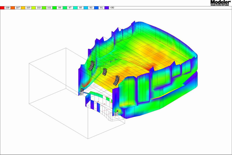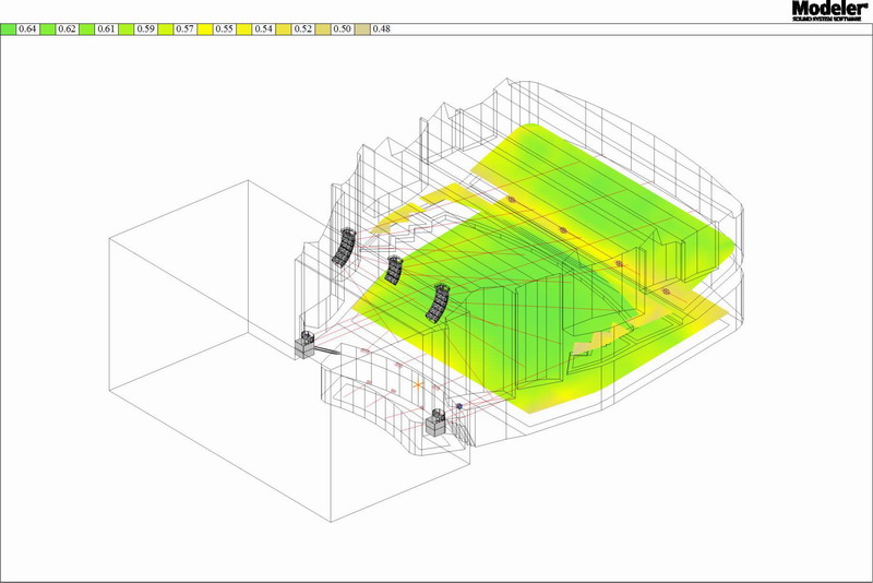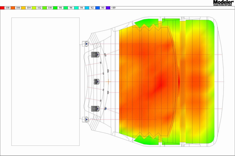 因此,我們通過(guò)Bose的聲場(chǎng)模擬分析軟件Modeler,對(duì)揚(yáng)聲器的安裝位置及角度進(jìn)行多次聲場(chǎng)模擬分析,最終采用非對(duì)稱(chēng)水平角度的弧形曲率陣列揚(yáng)聲器來(lái)實(shí)現(xiàn)最佳的音色平衡,減少側(cè)墻反射(從圖11可以看出,打在側(cè)墻的聲能量幾乎沒(méi)有),對(duì)不同位置的聽(tīng)音區(qū)提供均勻的聲覆蓋(從圖12可以看出,整個(gè)觀(guān)眾區(qū)的聲場(chǎng)覆蓋非常均勻)。